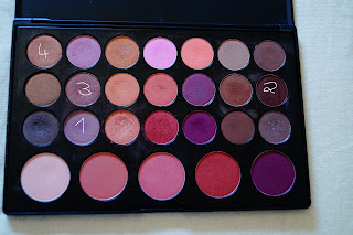 Jetzt kommt endlich ein bisschen Farbe ins Gesicht. Der erste Lidschatten kommt von Catrice und kommt auf das gesamte bewegliche Lid. Ein heller Lidschatten unterstützt auch nochmal die Farbkraft der anderen Lidschatten. Der nächste Lidschatten ist ein taubfarbener Lidschatten (Nummer 1) Dieser wird mit einem Blenderpinsel in die Lidfalte aufgetragen. Dann trage ich mit einem kleinem Lidschattenpinsel ein sehr dunkles Braun (Nummer 2) auf das äußere V auf. Dann gehe ich nochmal mit dem ersten Blenderpinsel in die Farbe 1 und 3 und verblende alles nochmals gut.